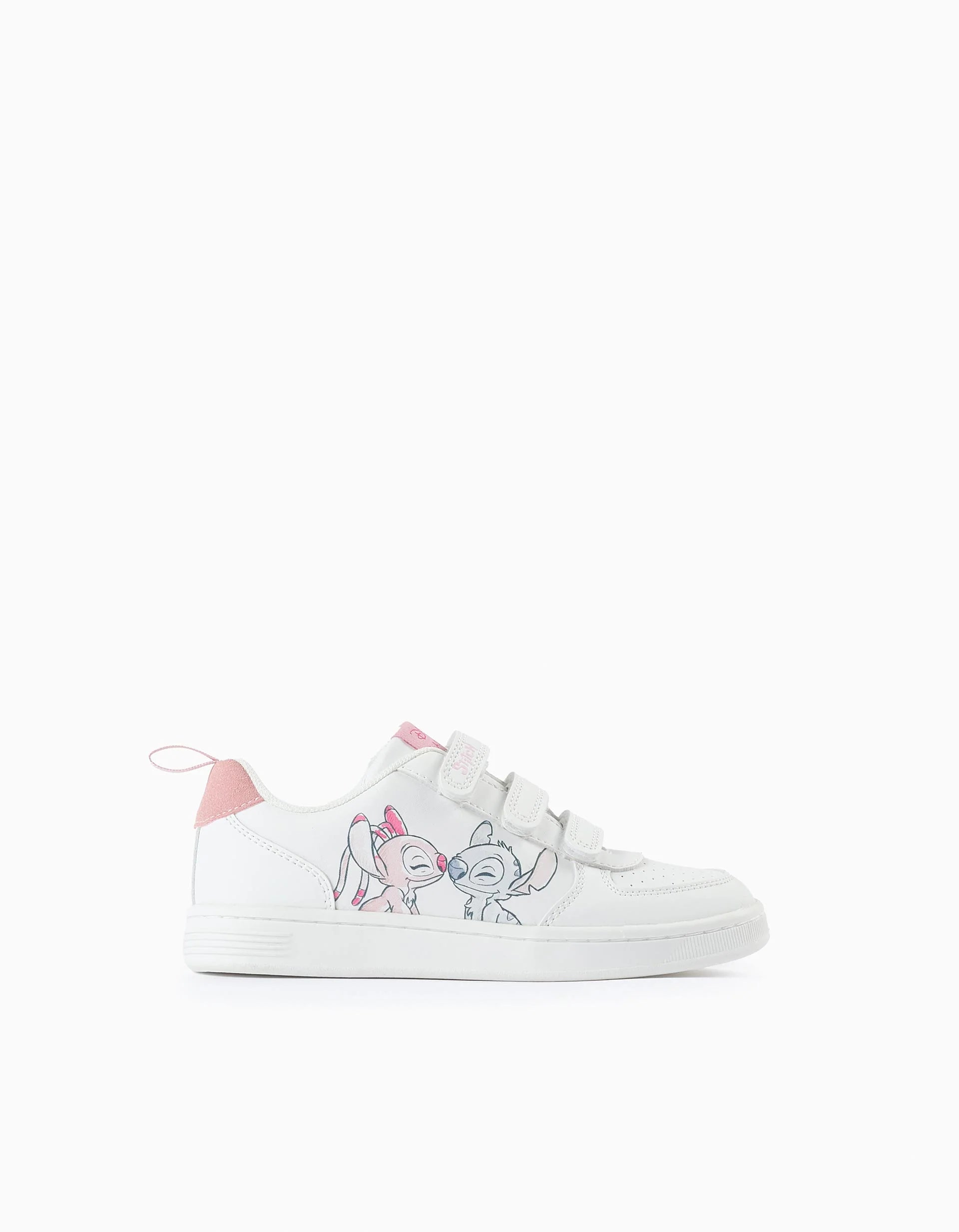 Sapatilhas brancas para menina, fabricadas em pele sintética e com forro em mesh para máxima respirabilidade. Com estampado lateral das personagens Stitch e Angel. Aperta com tiras autoaderentes para calçar facilmente. Um par de sapatilhas confortáveis e amorosas para as fãs da série Lilo & Stitch!