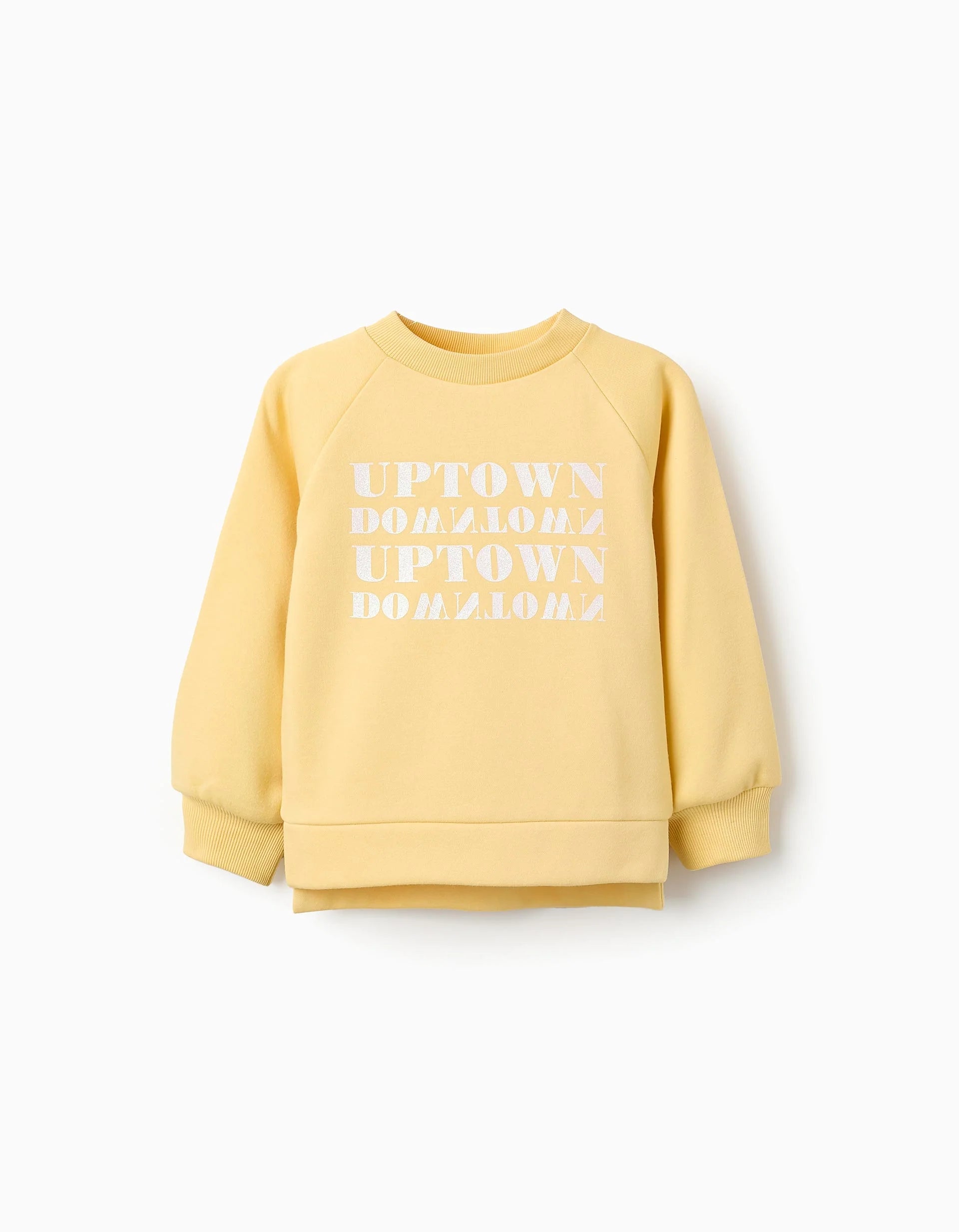 Sweat amarelo para menina, com o interior cardado para maior conforto térmico. Estampado relacionado com o tema de Nova Iorque, com purpurinas. Gola e punhos canelados para um ajuste perfeito. Base assimétrica, orientada mais comprida para trás, com pequenas aberturas nas laterais que lhe conferem uma ar mais fluida. Um suor prático e confortável, ideal para looks casuais.