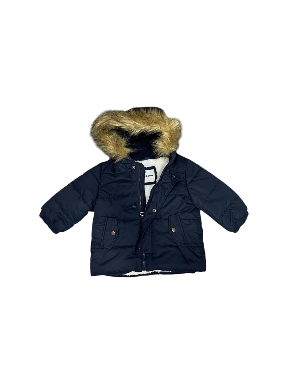 Casaco almofadado, com um modelo de capuz forrado com orla de pelo sintético. Pequena gola subida e fecho éclair na frente sob aba corta-vento com botões de pressão ocultos. Bolsos laterais e elástico na extremidade das mangas.
