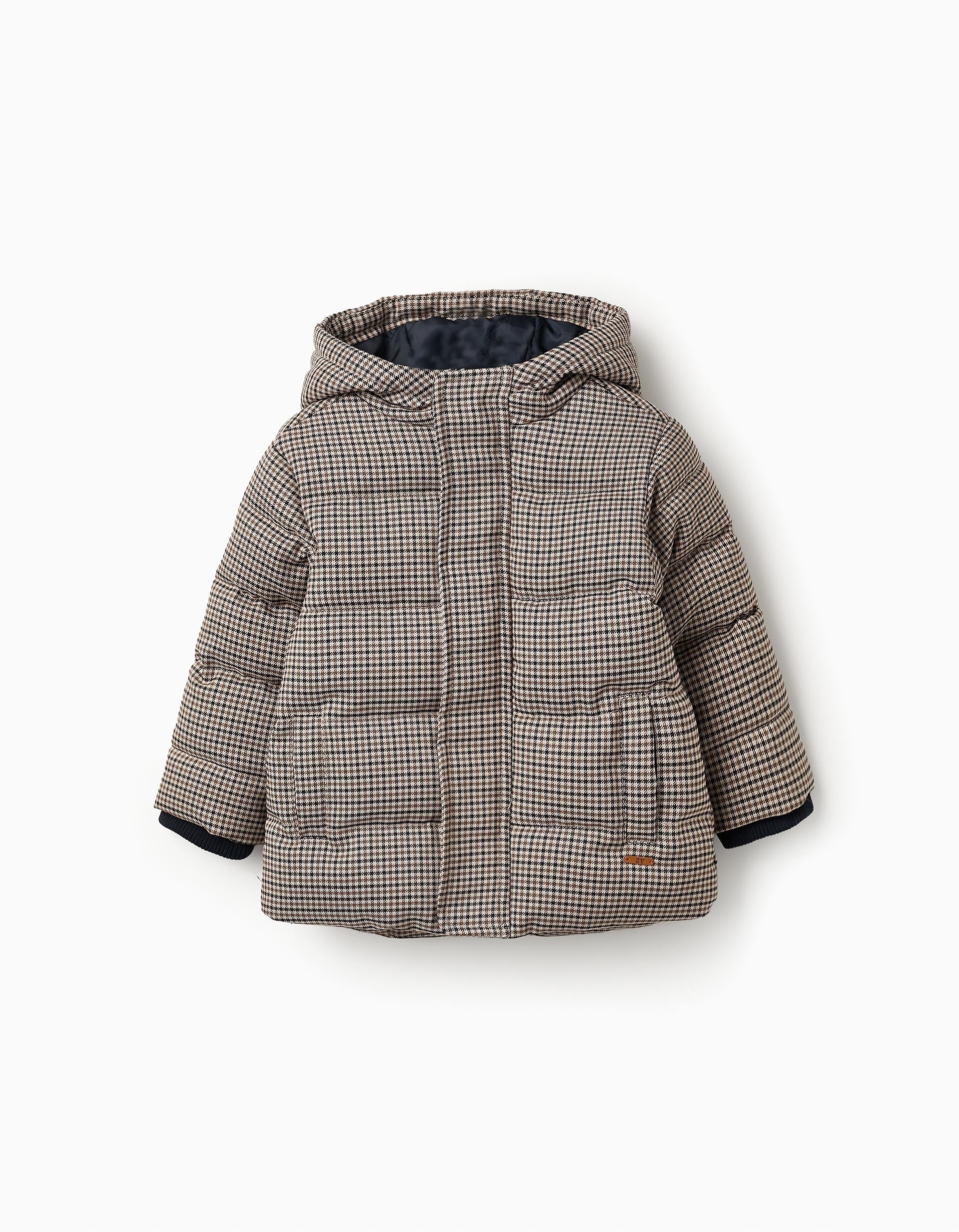 Casaco acolchoado com capuz para menino. Com padrão pied de poule em preto e camel. Punhos canelados para um ajuste perfeito. Bolsos laterais. Aperta facilmente com fecho de correr e botões de pressão. Etiqueta interior para colocar o nome da criança.