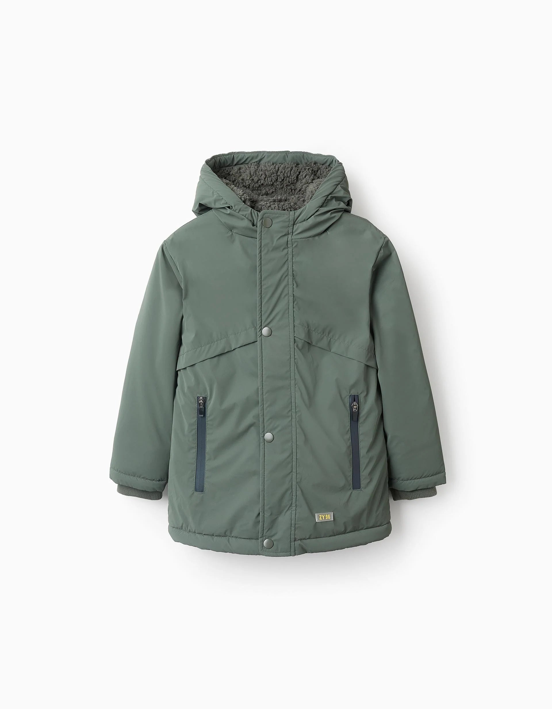Parka verde para menino, com interior em sherpa para maior conforto térmico. Com capuz. Aperta com fecho de correr e com botões de pressão. Punhos interiores canelados pra um ajuste perfeito. Etiqueta interior para escrever o nome da criança. Comprimento médio. Uma parka aconchegante, prática e confortável, ideal para qualquer estilo.