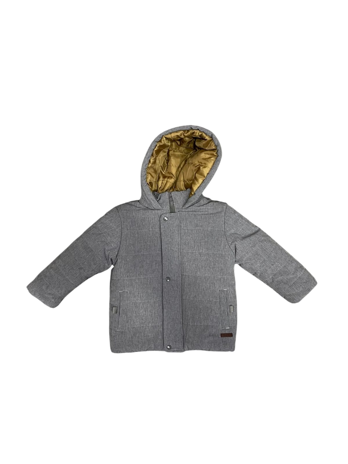 Casaco almofadado, pequena gola subida e fecho éclair na frente sob aba corta-vento com botões de pressão ocultos. Bolsos laterais e elástico na extremidade das mangas.