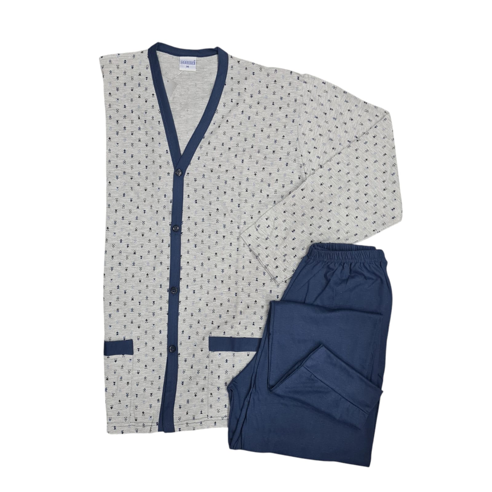 O pijama é composto por um casaco estampado de manga comprida, sem gola e botões na frente, calças lisas, com elástico revestido e com punho.