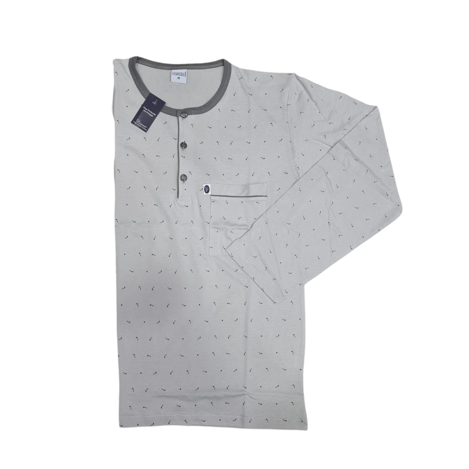 O pijama é composto por camisola de manga comprida estampada, com botões na frente, calças lisas, com elástico revestido e sem punho.