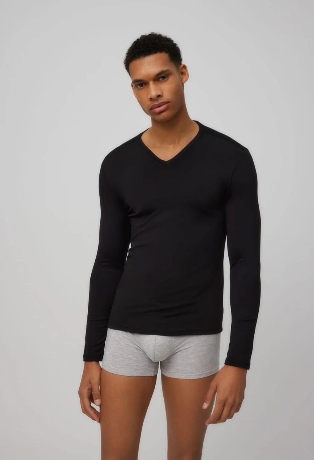 Men's thermal t-shirt with long sleeves and a V-neck. The thermal t-shirt that retains body heat inside. Made with the highest quality standards and with a fleecy interior, this product is ideal for colder winters.
