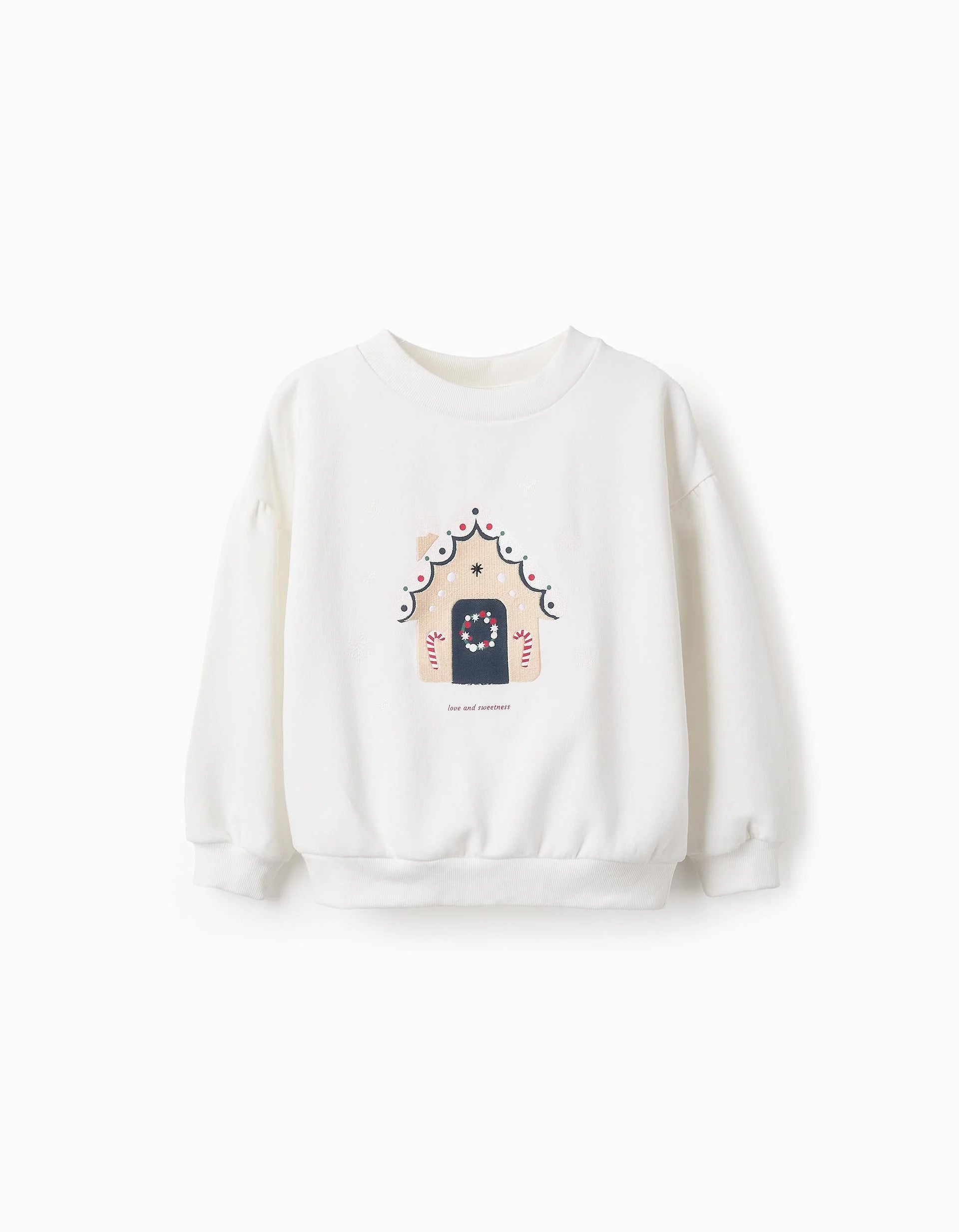 Sudadera blanca para niña, con interior cardado para mayor confort térmico. Estampado frontal de una casa navideña con purpurina y detalles en relieve. Hombros caídos y mangas acampanadas para darle un toque de estilo. Puños y base de canalé para un ajuste perfecto. Una acogedora sudadera navideña, perfecta para la temporada festiva.